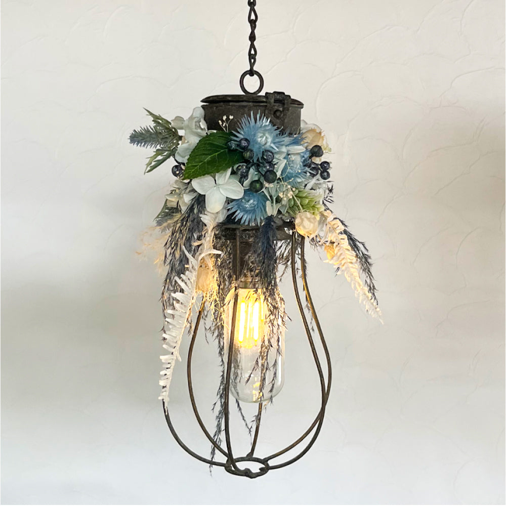 ドライフラワーとアーティフィシャルフラワーで装飾したおしゃれな吊り下げ式のランプ(ペンダントライト)