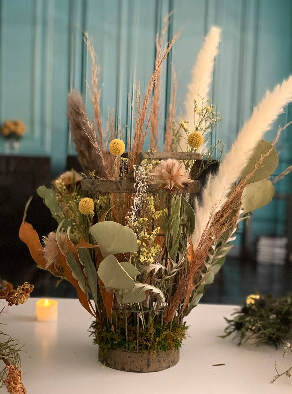 実り豊かな小高い丘をイメージして作りました。素朴さと可愛らしさがマッチした、心安らぐインテリアライトに仕上げています。まん丸のクラスペディアが愛らしいアクセント!