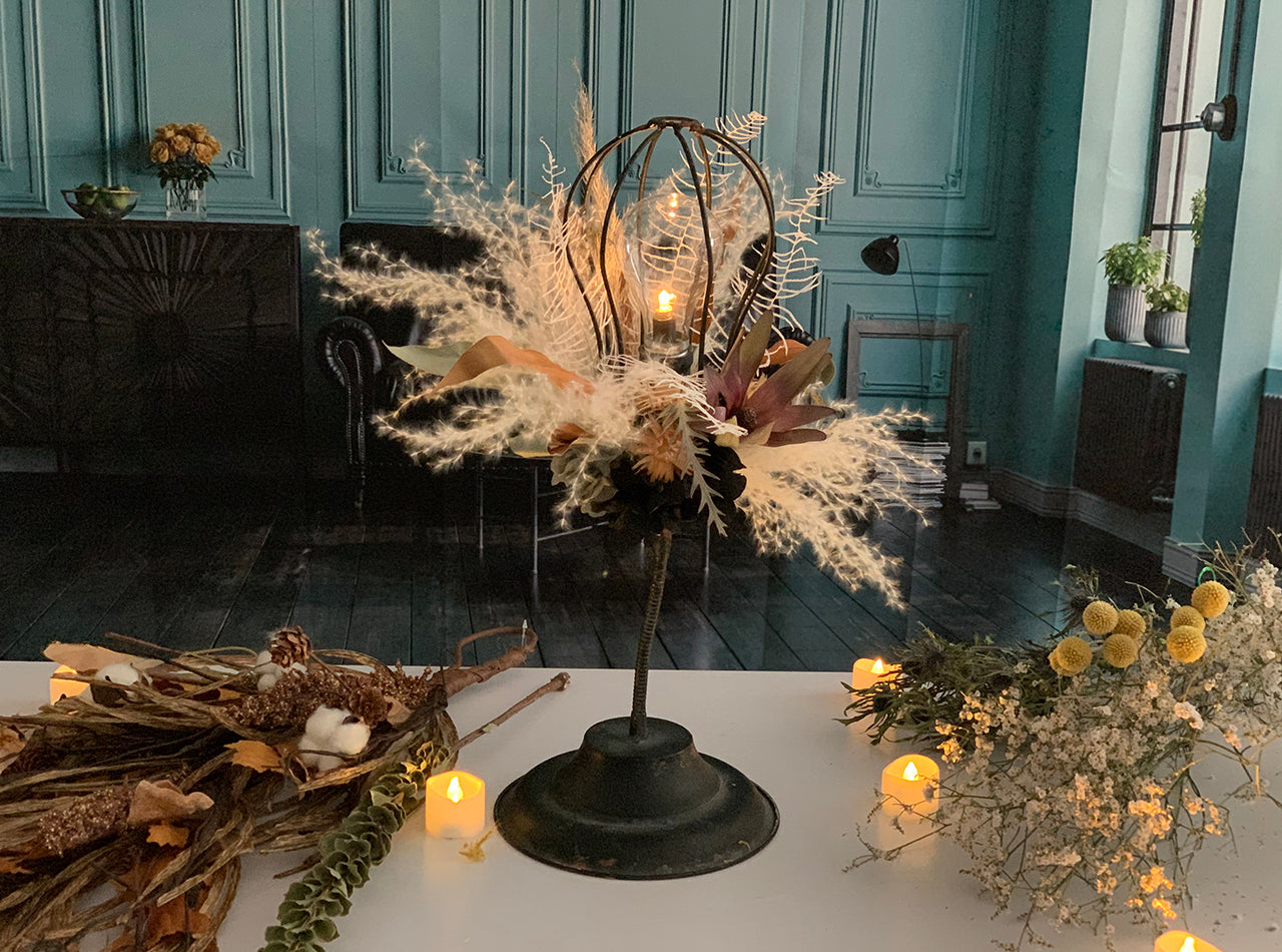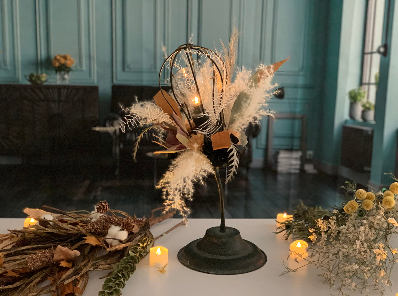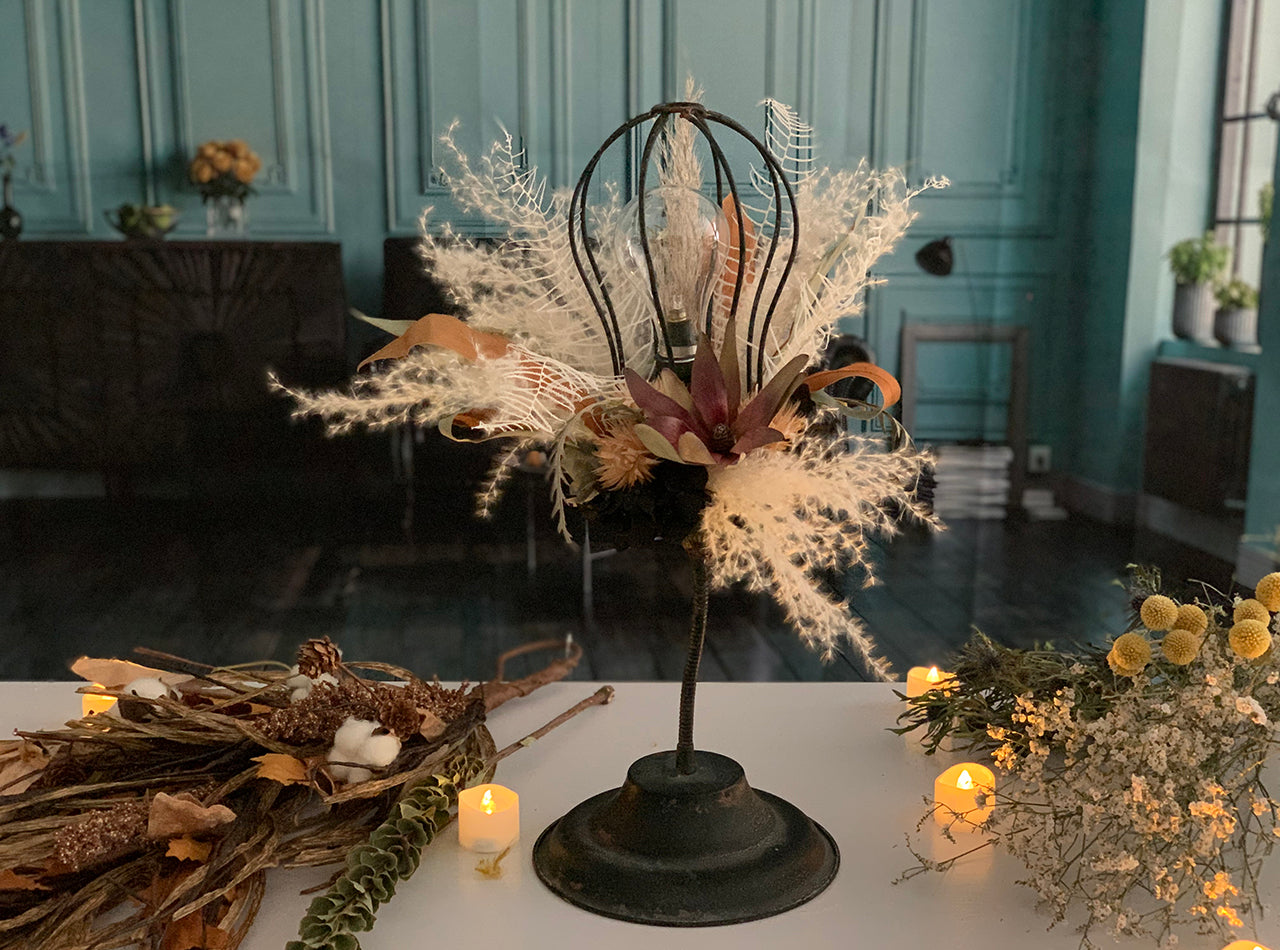 ドライフラワーのランプがお部屋を華やかに彩り、