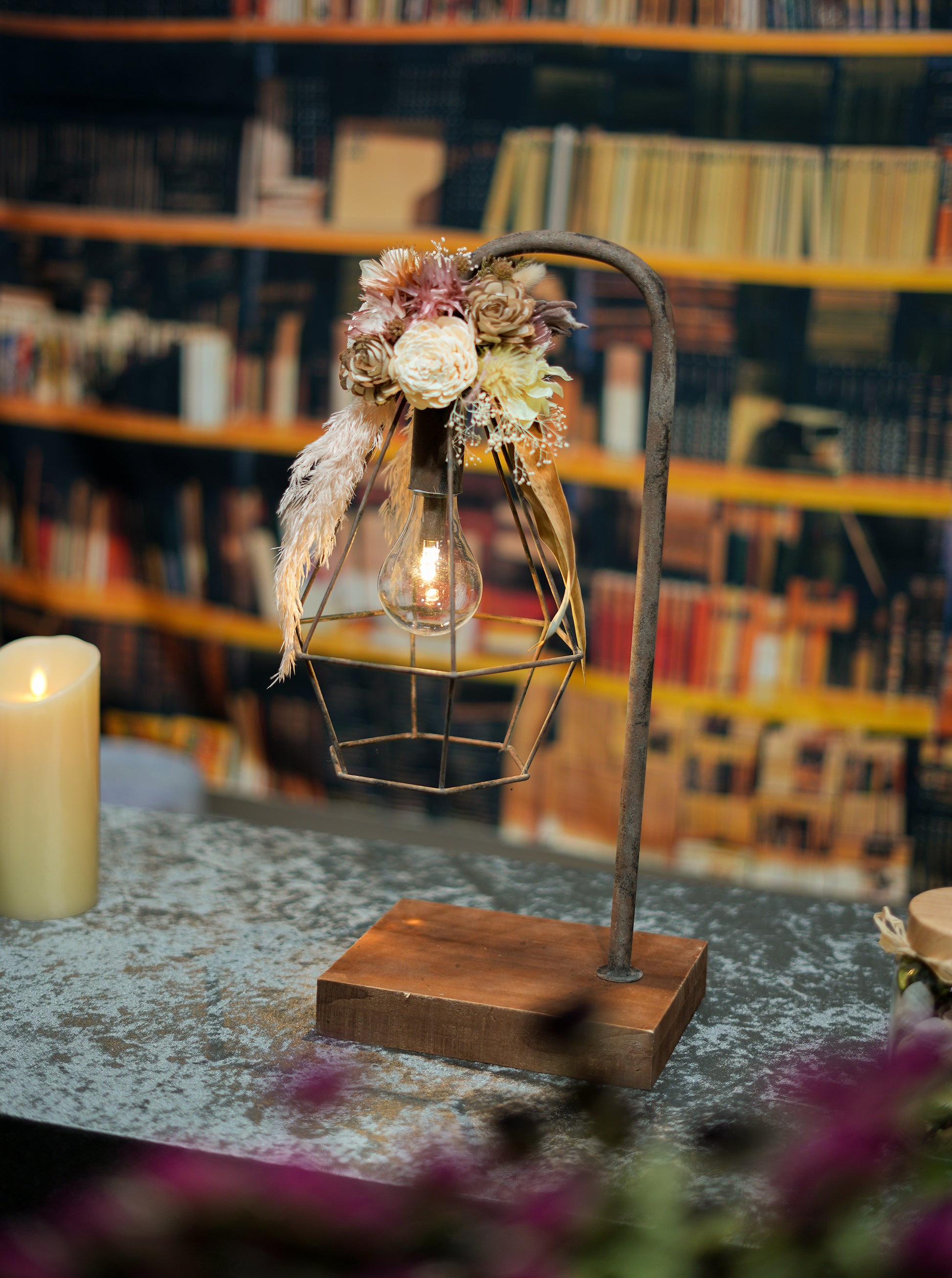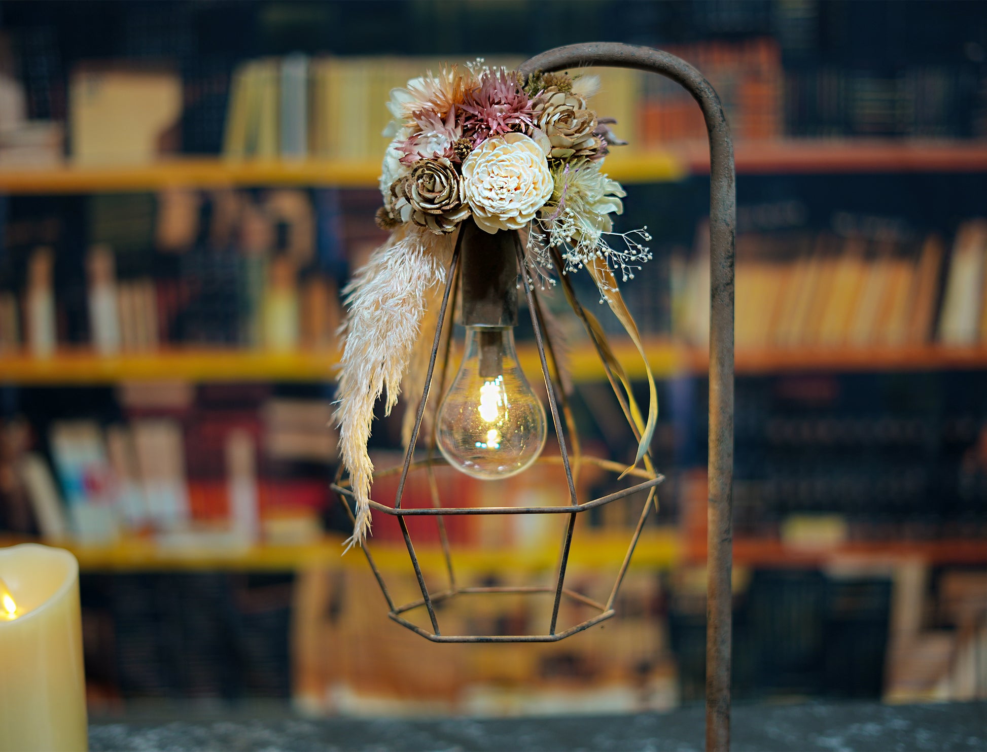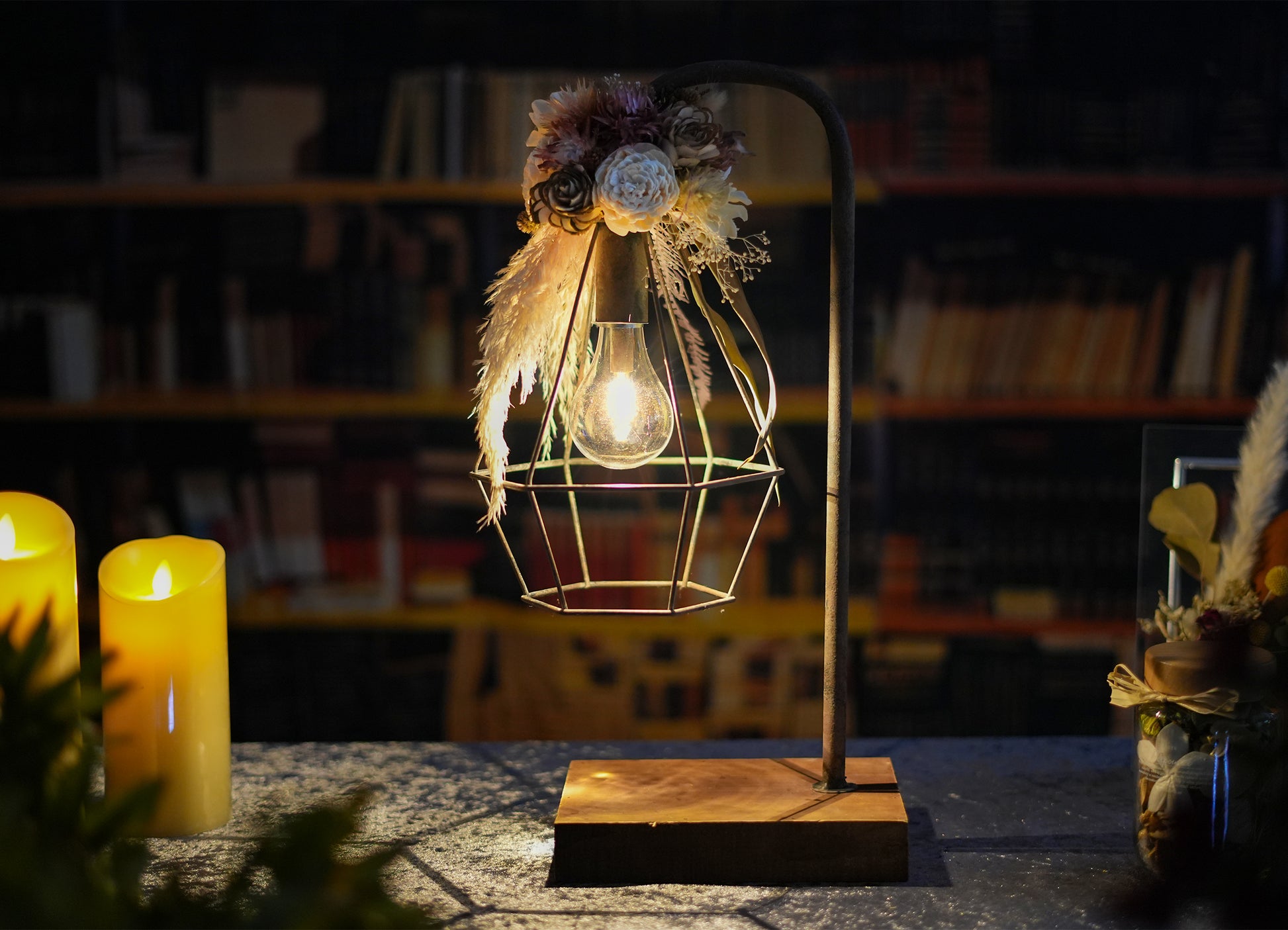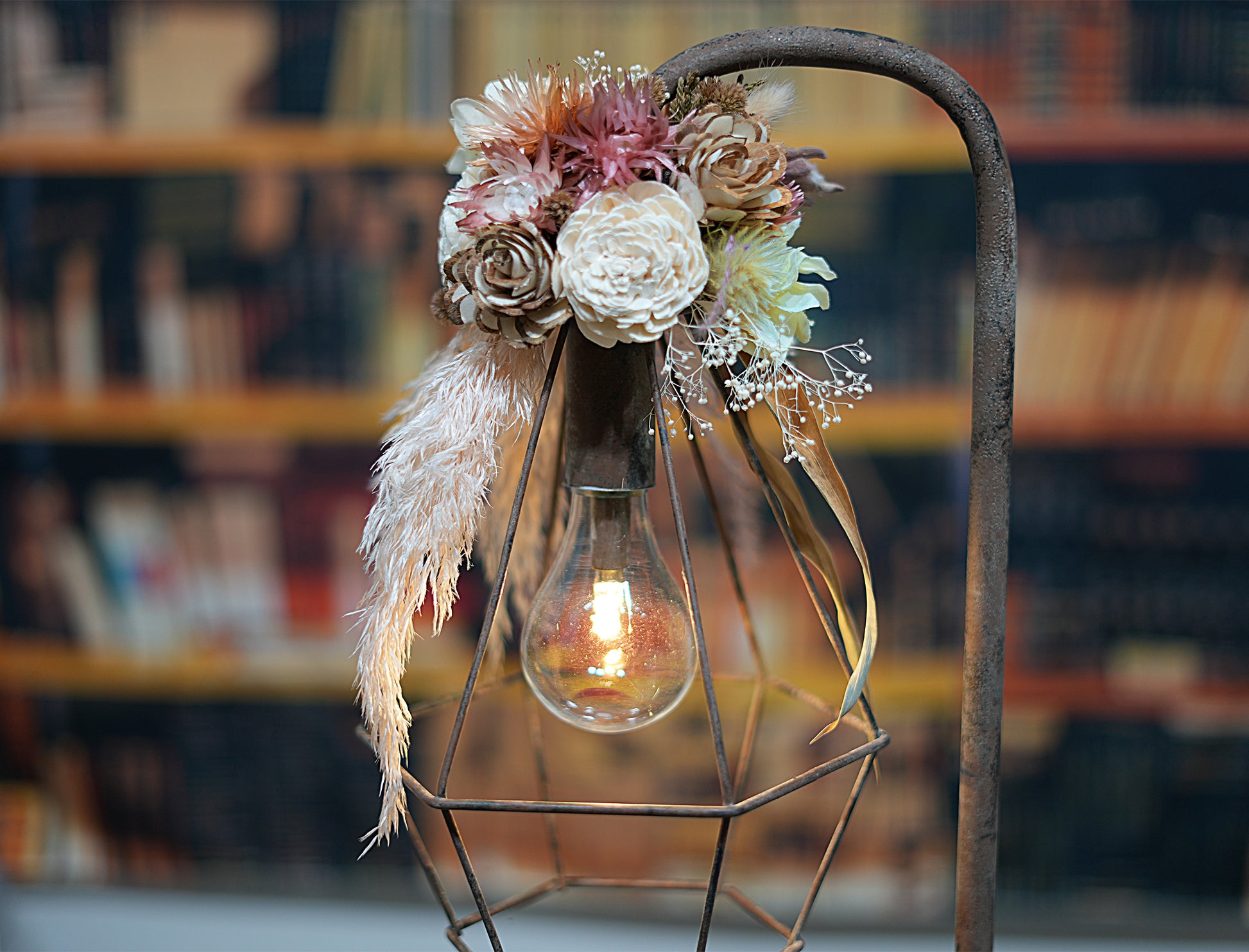 ドライフラワーのランプがお部屋を華やかに彩り、