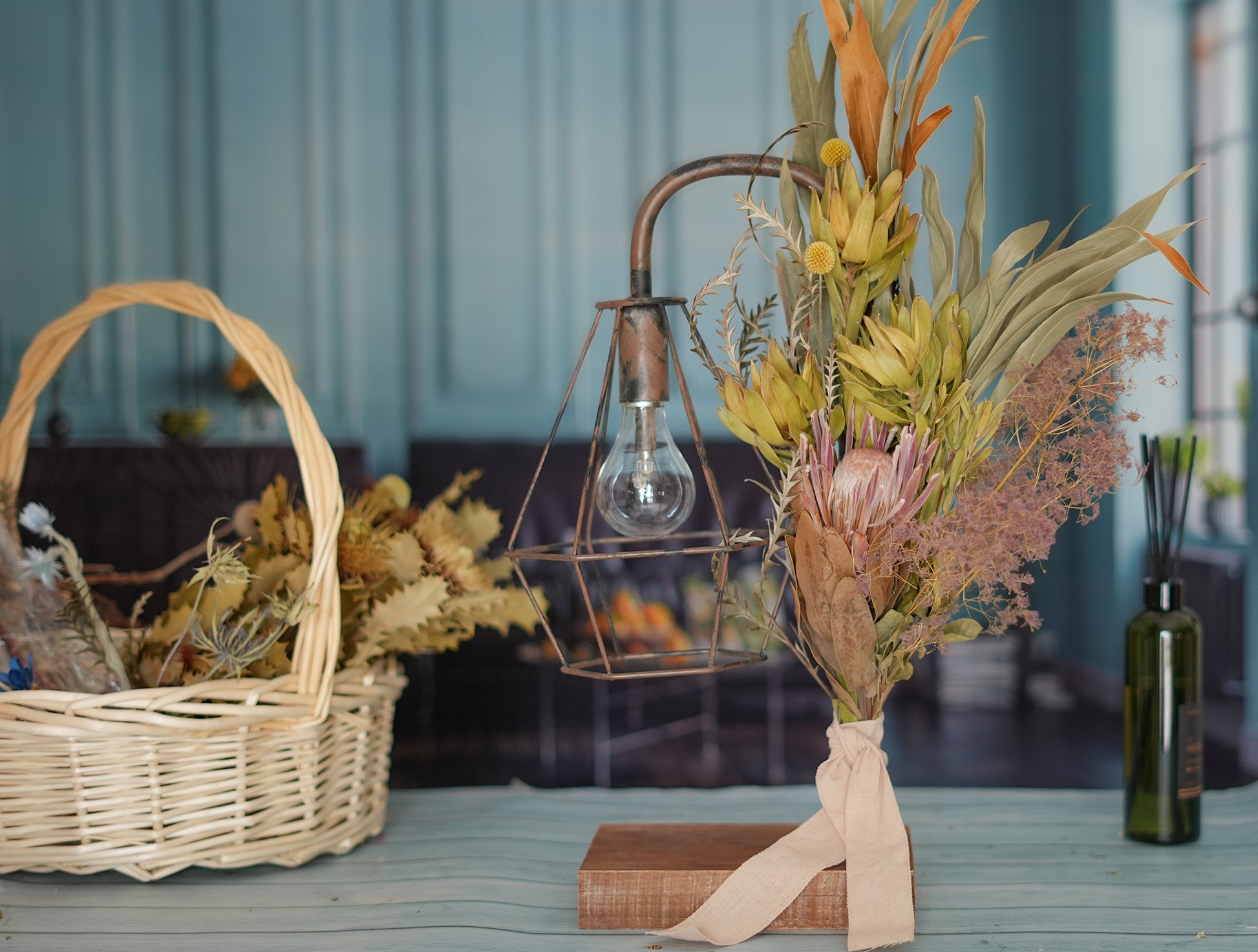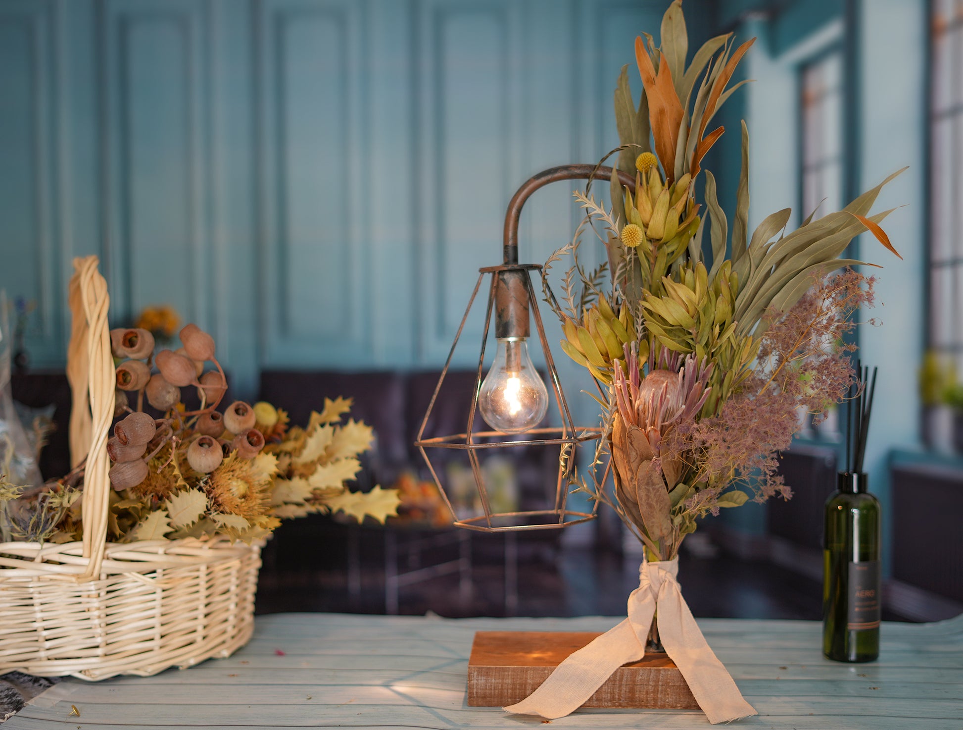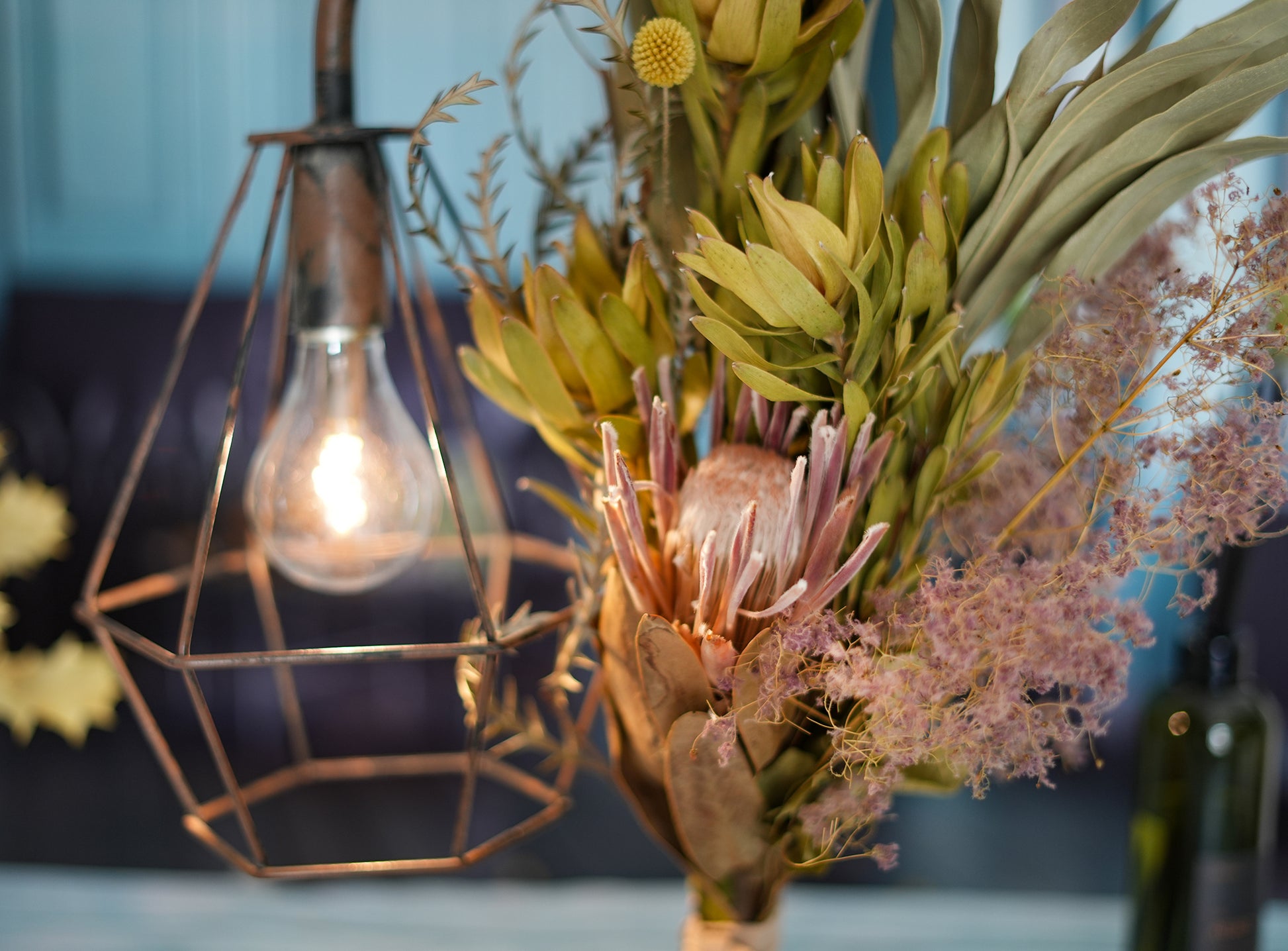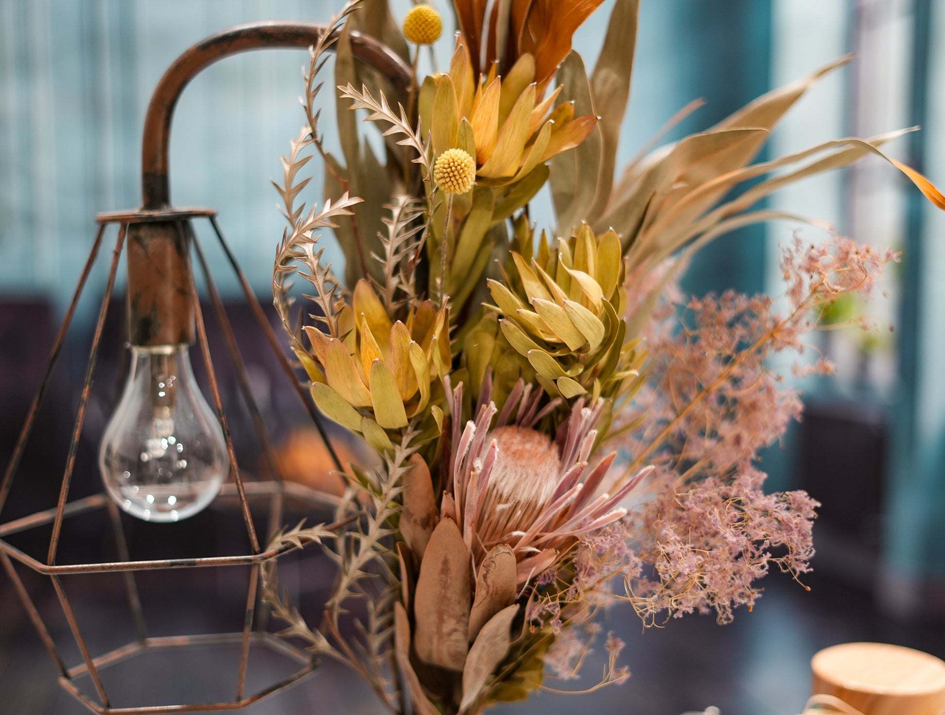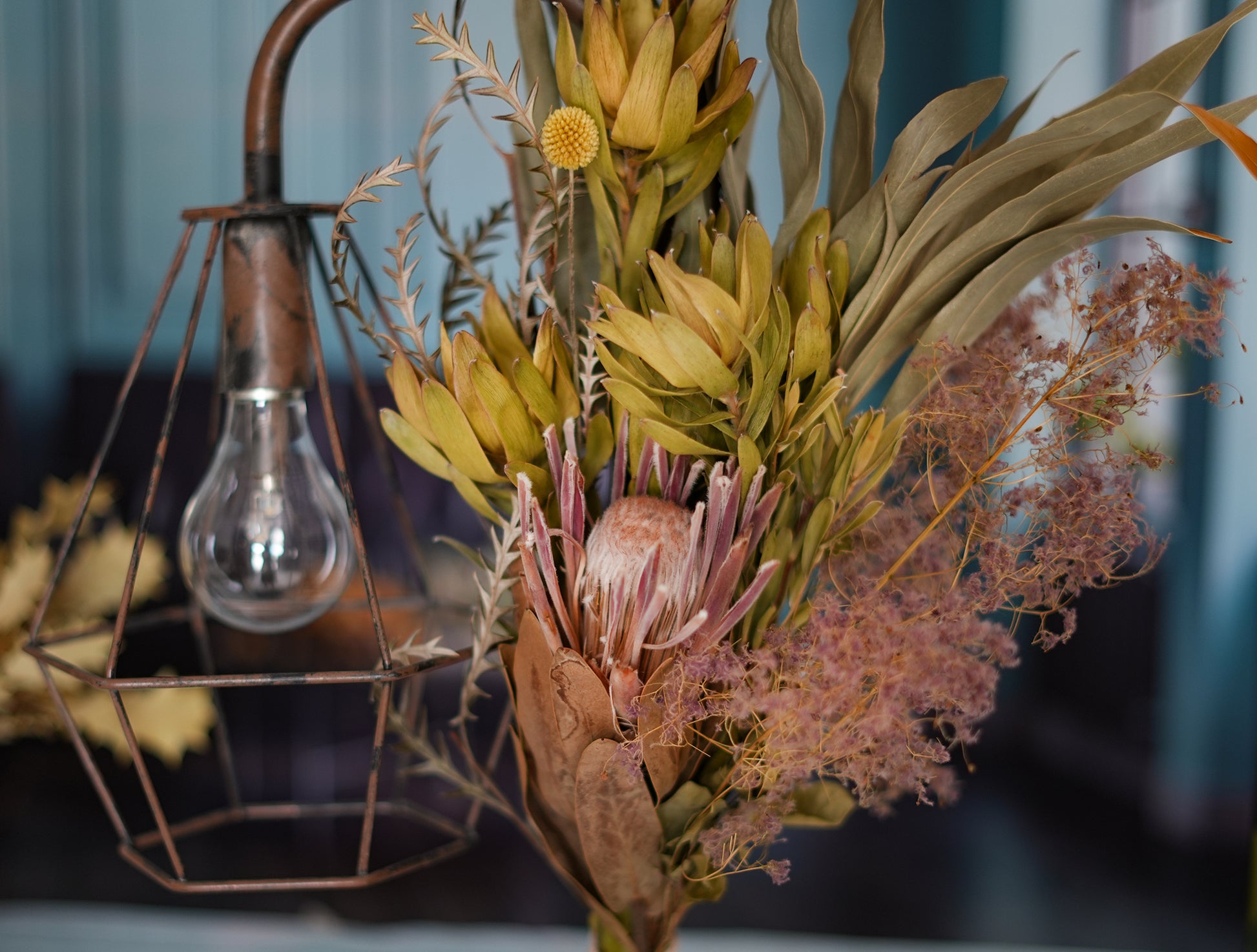 プロテアやリューカデンドロンなど、人気のワイルドフラワーを使用したブーケでランプを装飾しました。