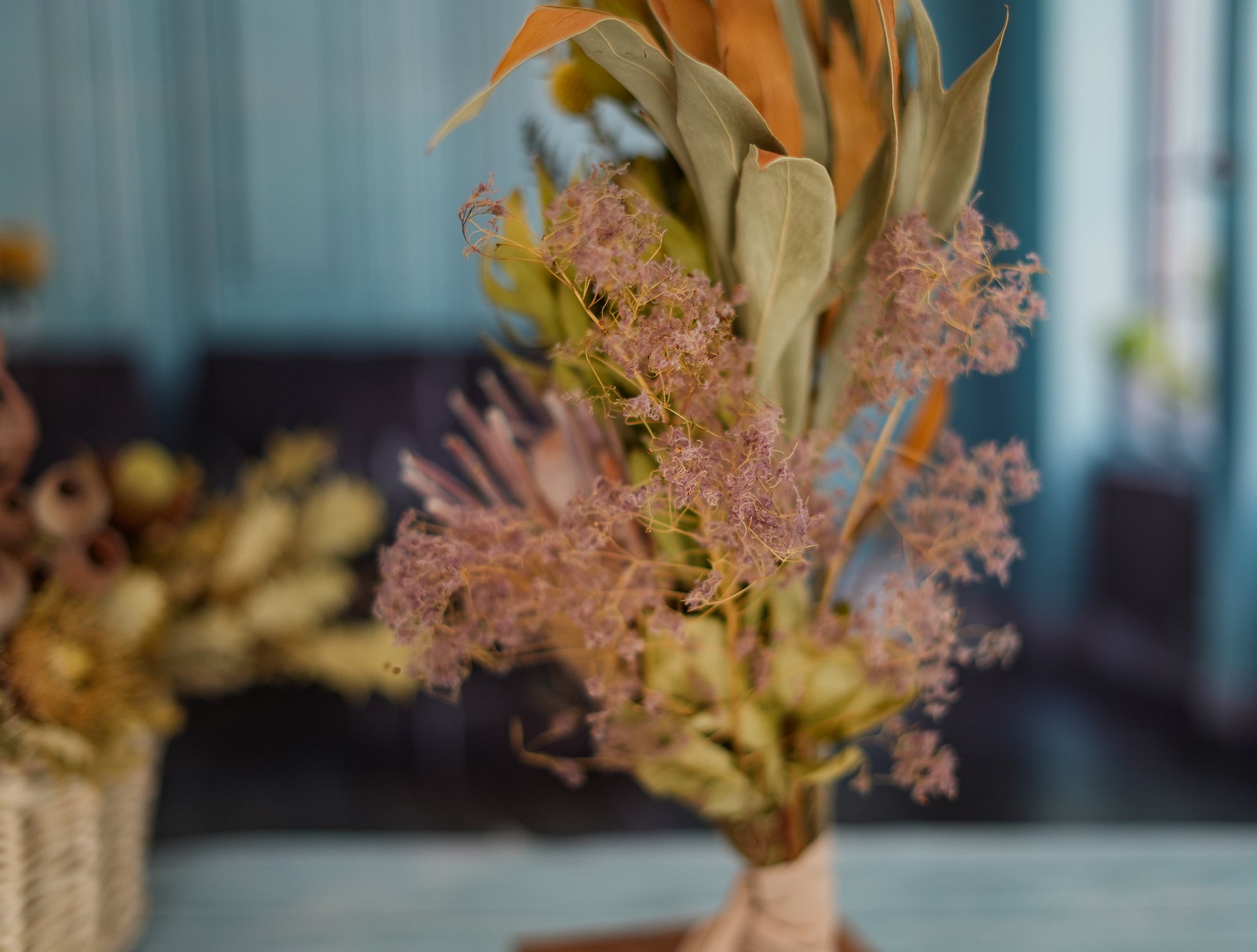 ドライ:リューカデンドロン、グレビレアアイバンホー、グレビレアゴールド、プロテア、ビリーボタン、スモークツリー
