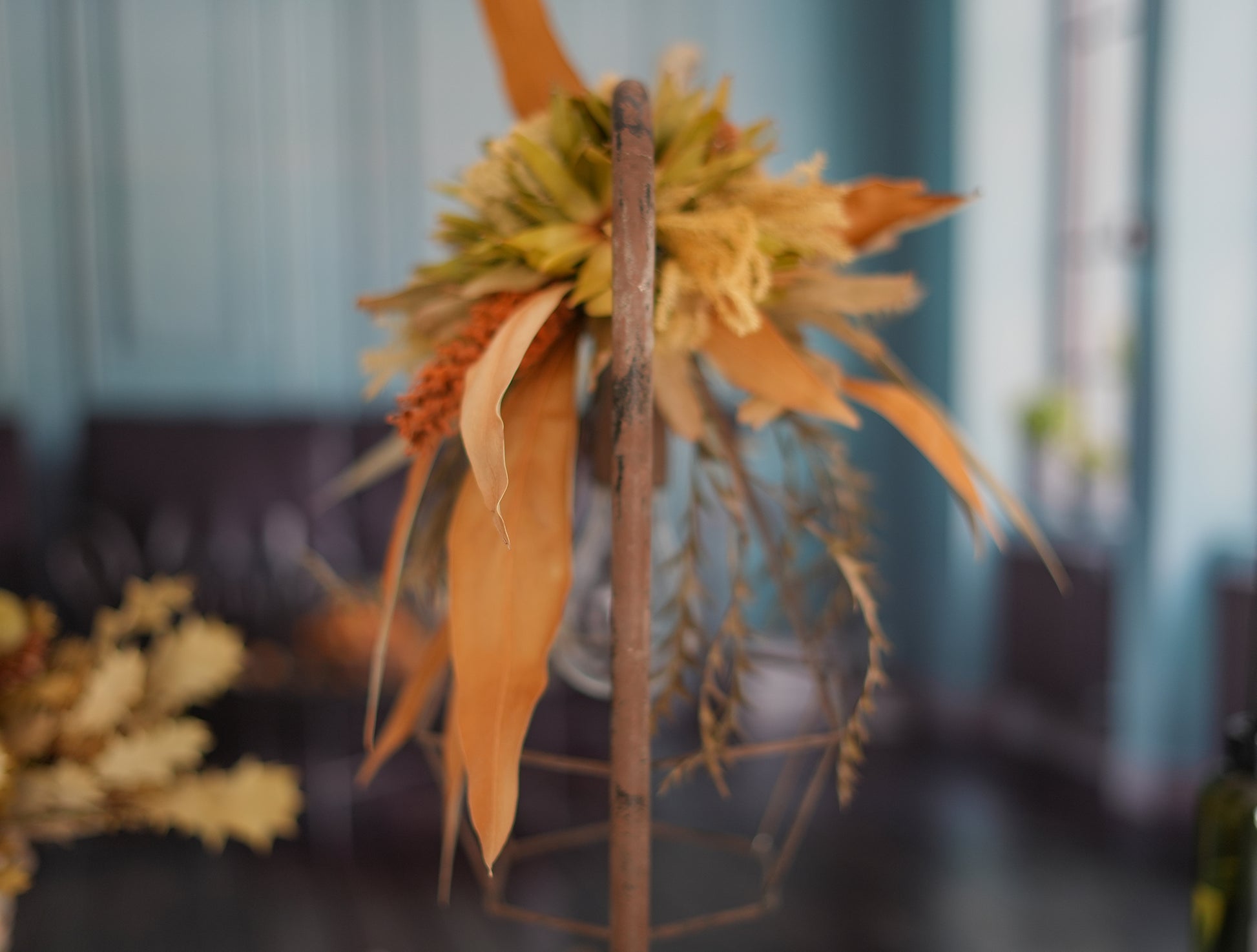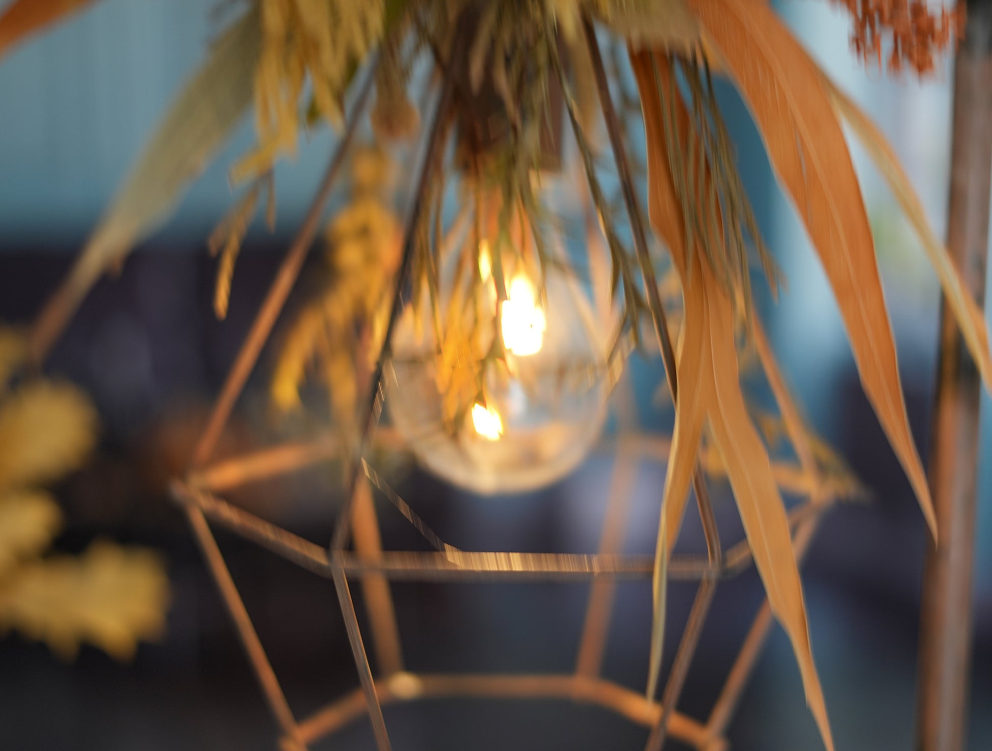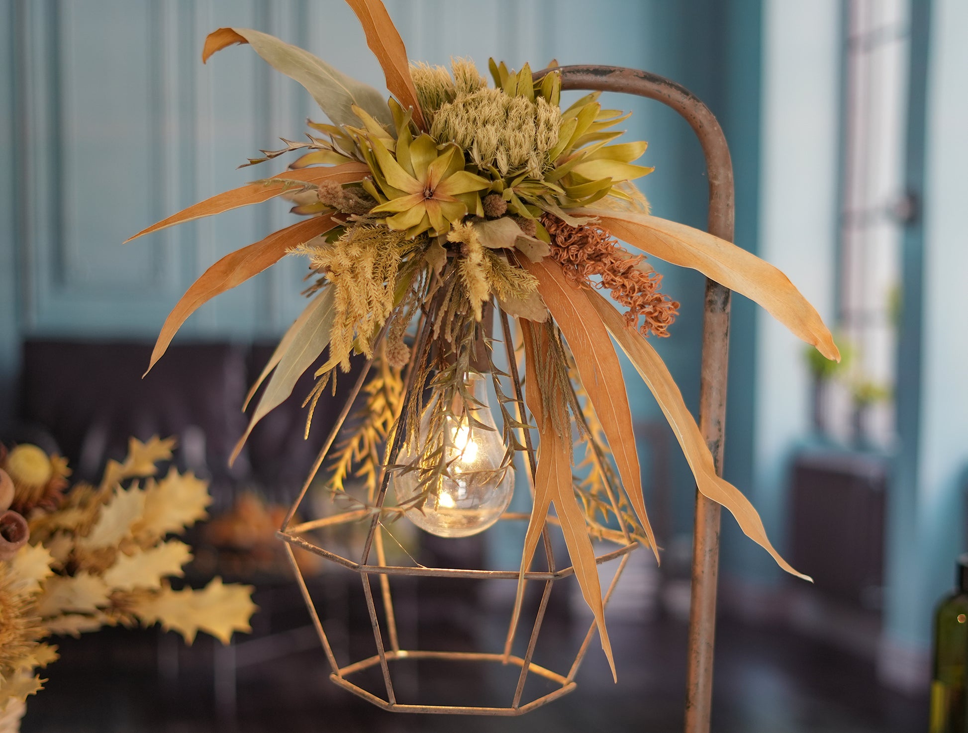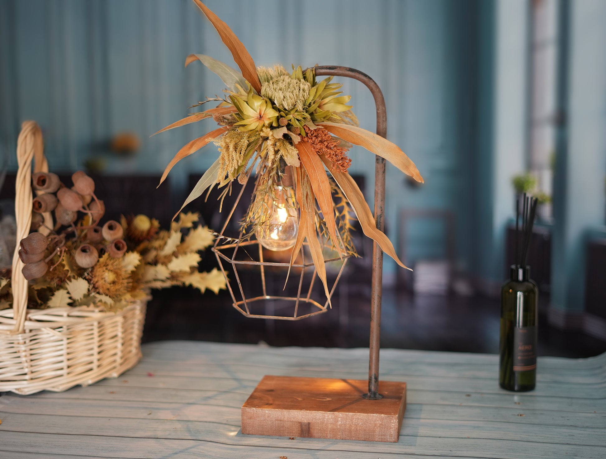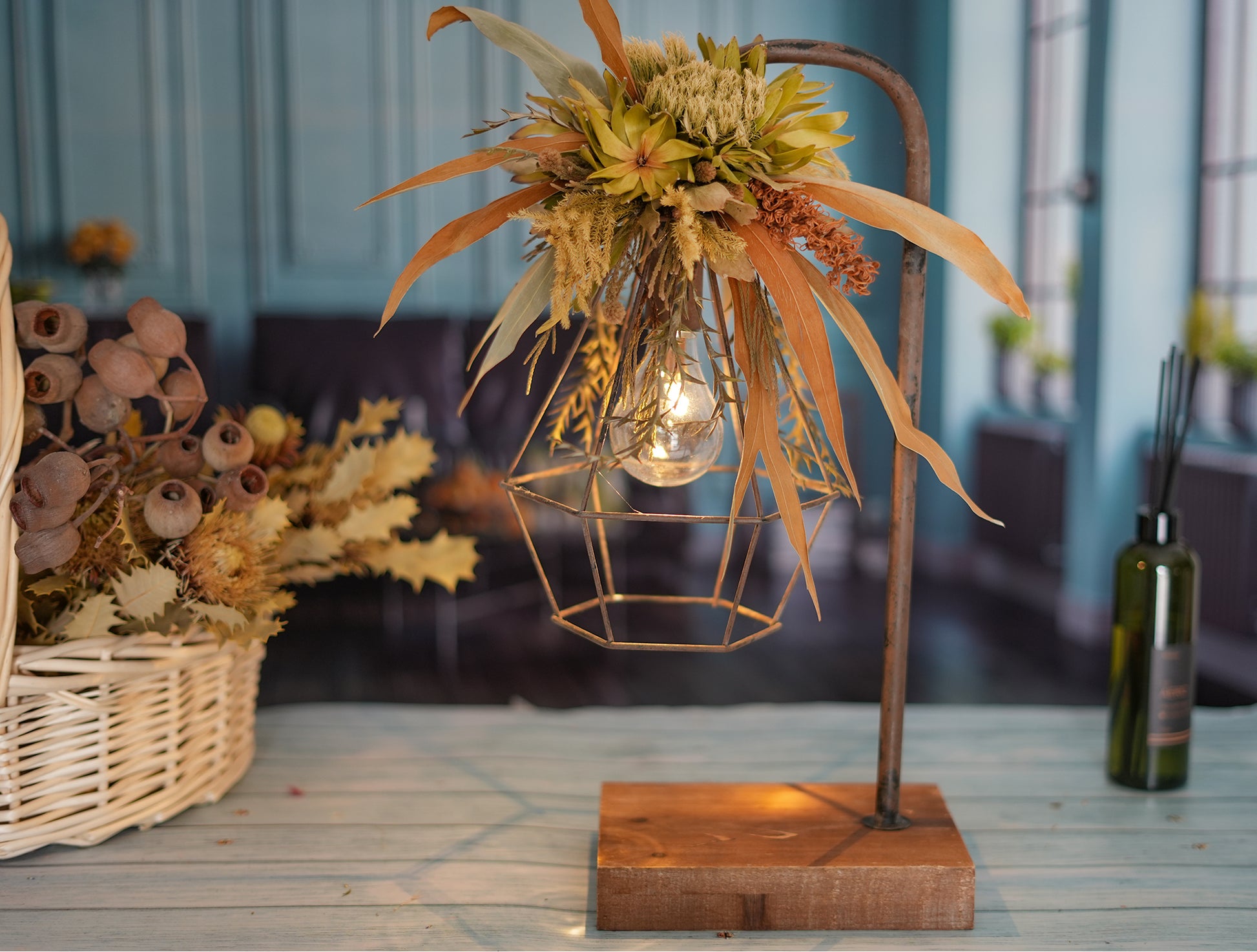 ドライフラワーのランプがお部屋を華やかに彩り、