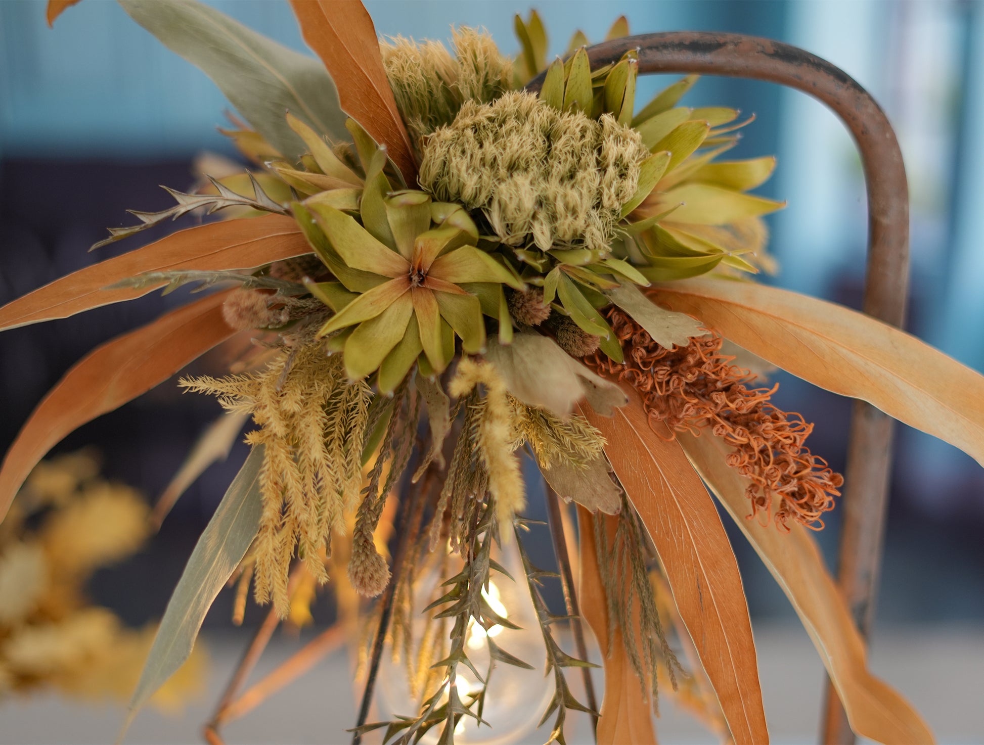 ドライ:リューカデンドロン、グレビレアアイバンホー、グレビレアゴールド、プロテア、ビリーボタン、スモークツリー